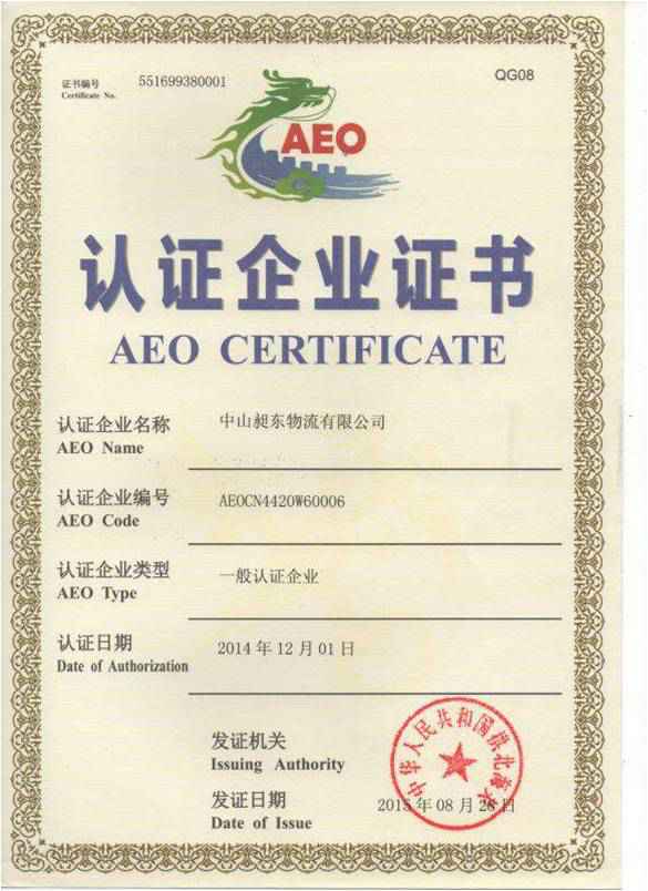 • Certified enterprise certificate of AEO Certificate (East Changer logistics)