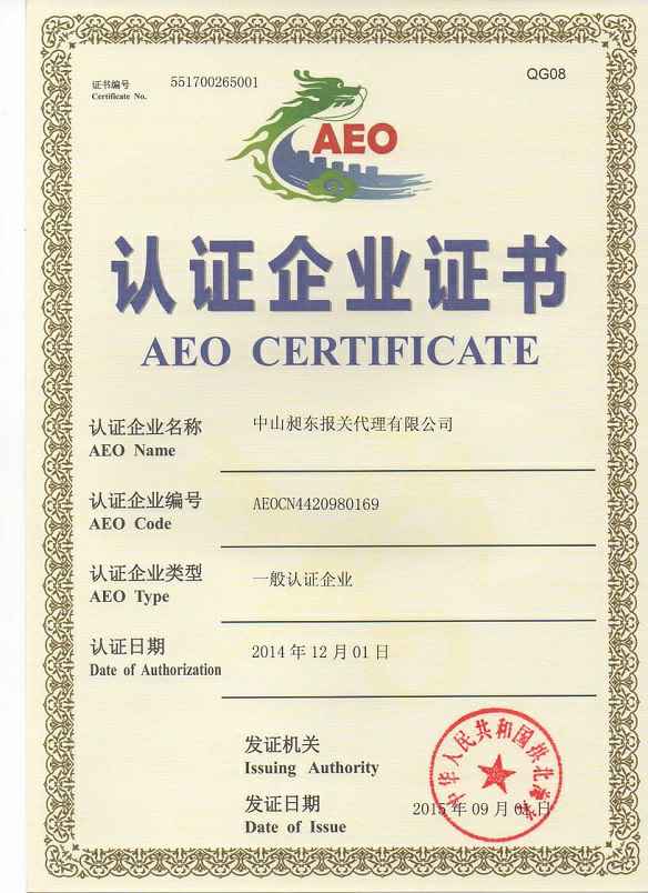• Certified enterprise certificate of AEO Certificate (East Changer customs broker)